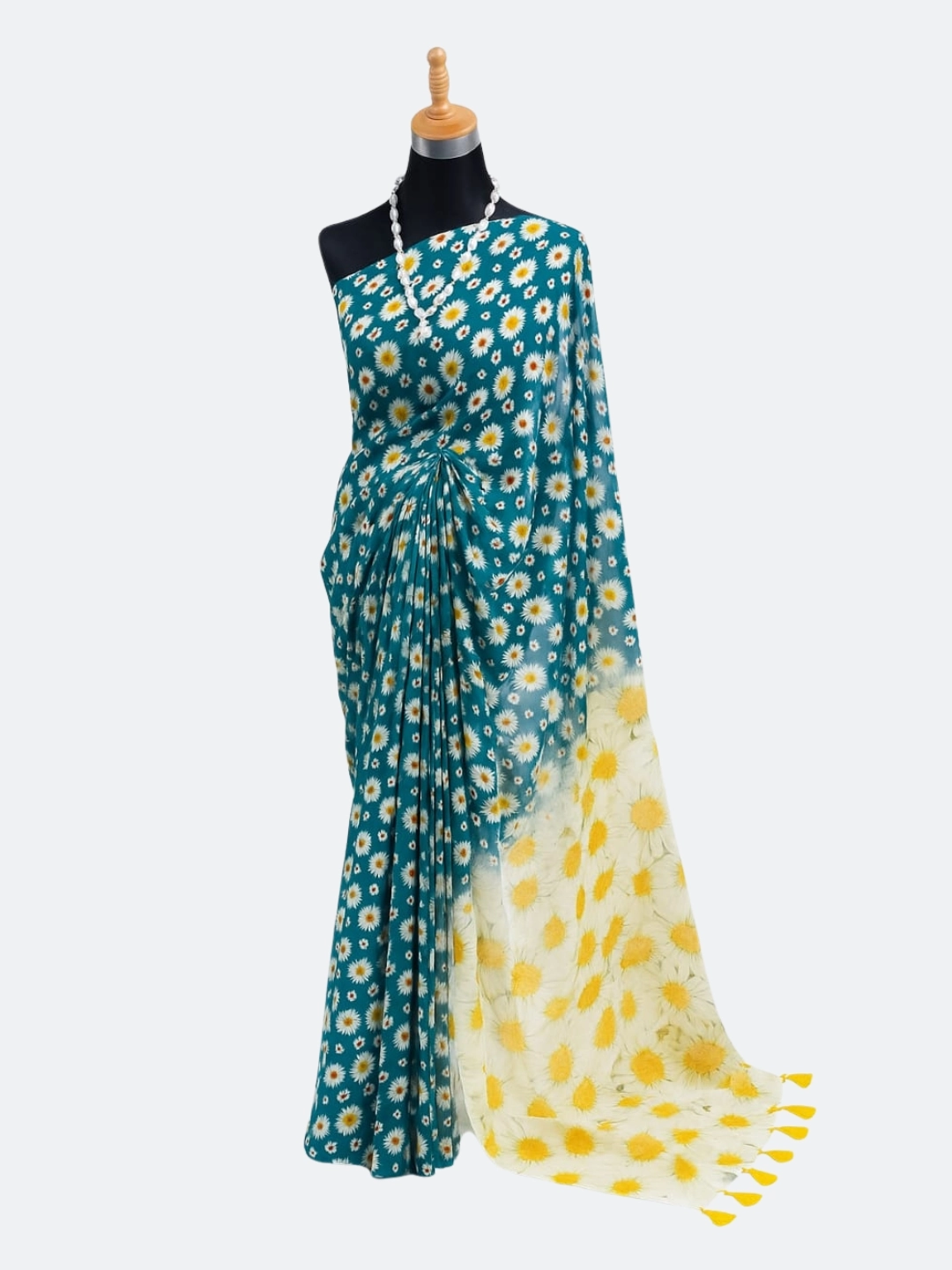 সুন্দর টিল রঙের জর্জেট শাড়ি উইথ ডেইজি প্রিন্ট, যা পরতে আরামদায়ক এবং ফ্যাশনেবল।