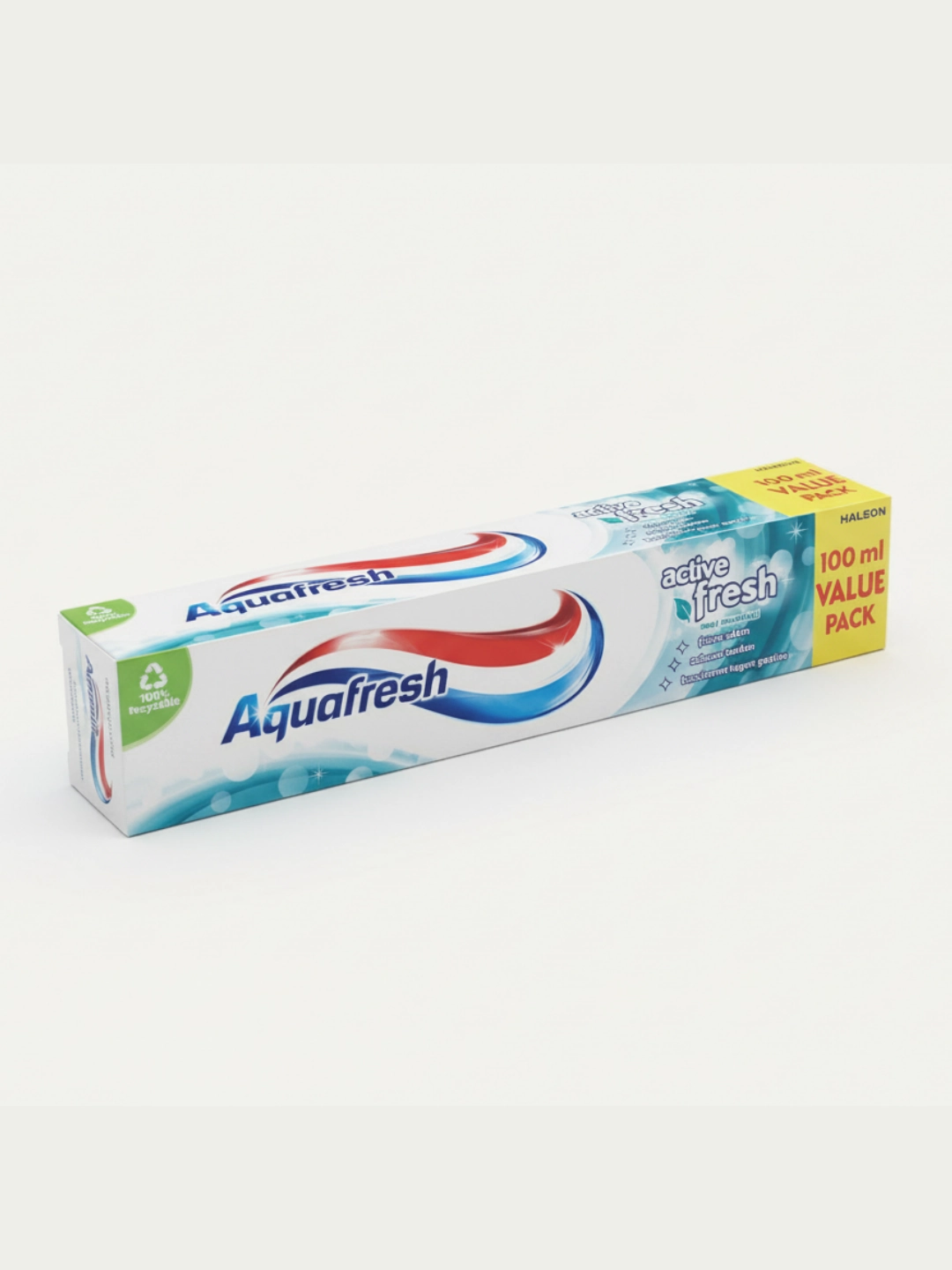 Aqua Fresh Active Fresh Toothpaste provides strong teeth, healthy gums, and long-lasting fresh breath. Packaged in a 100ml value pack with 100% recyclable packaging, it is designed for daily oral care.