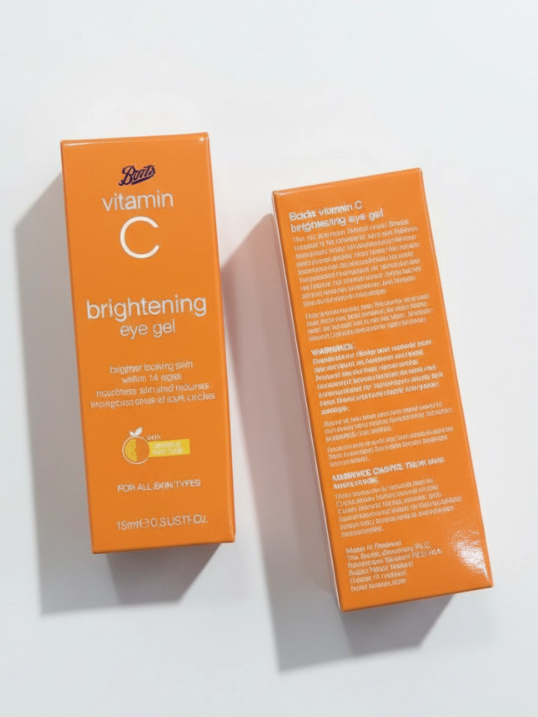 Boots Vitamin C Brightening Eye Gel is formulated with Vitamin C to reduce puffiness, dark circles, and signs of tiredness. Within 14 days, it promises a brighter and refreshed under-eye appearance. Dermatologically tested and suitable for all skin types. 15 ml tube.