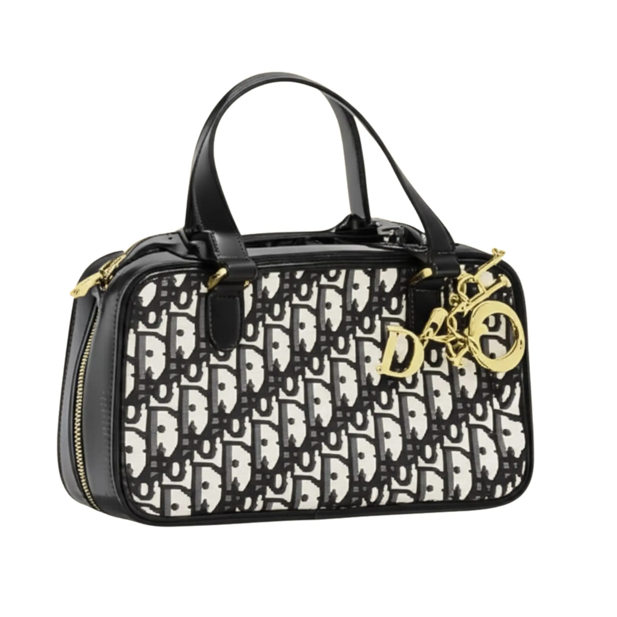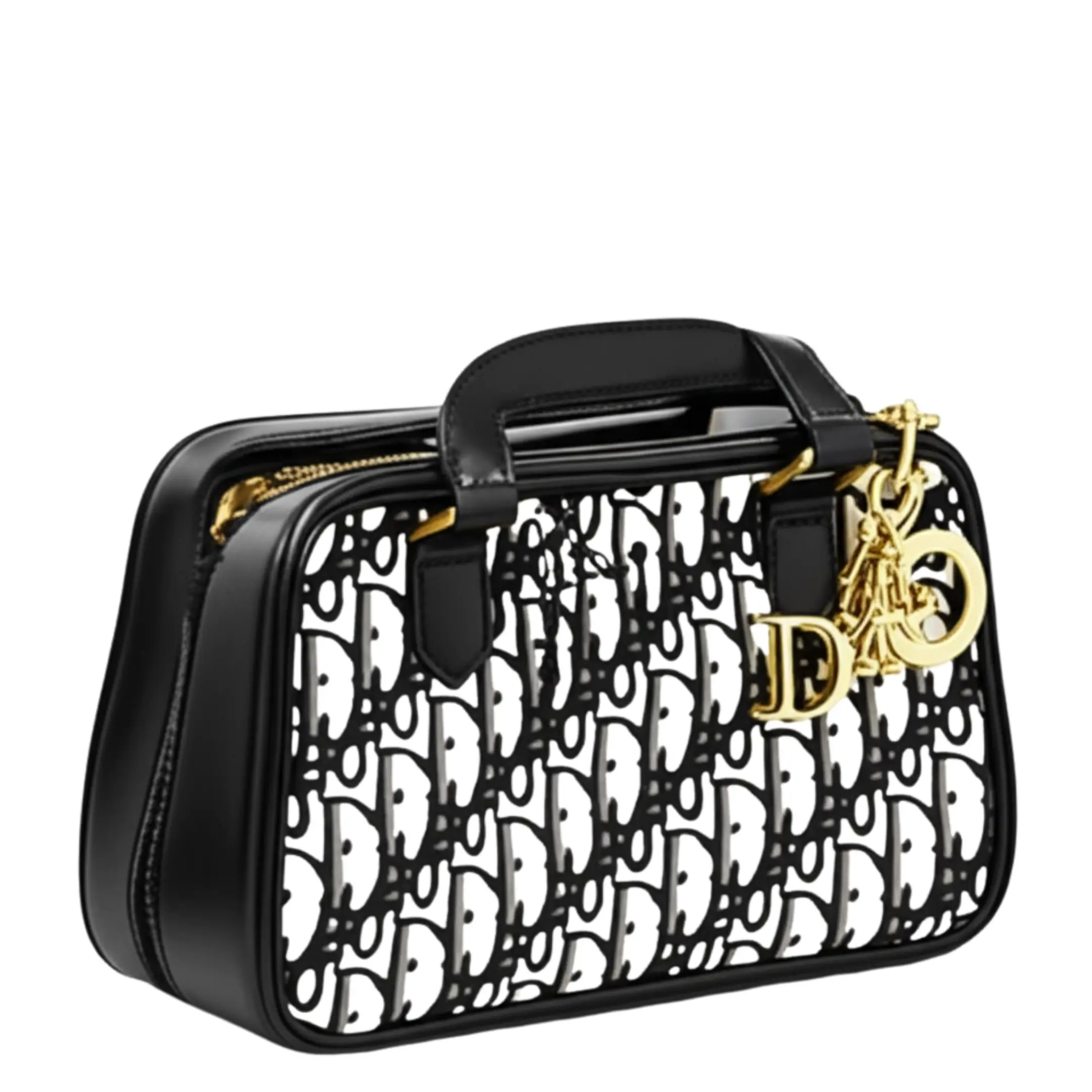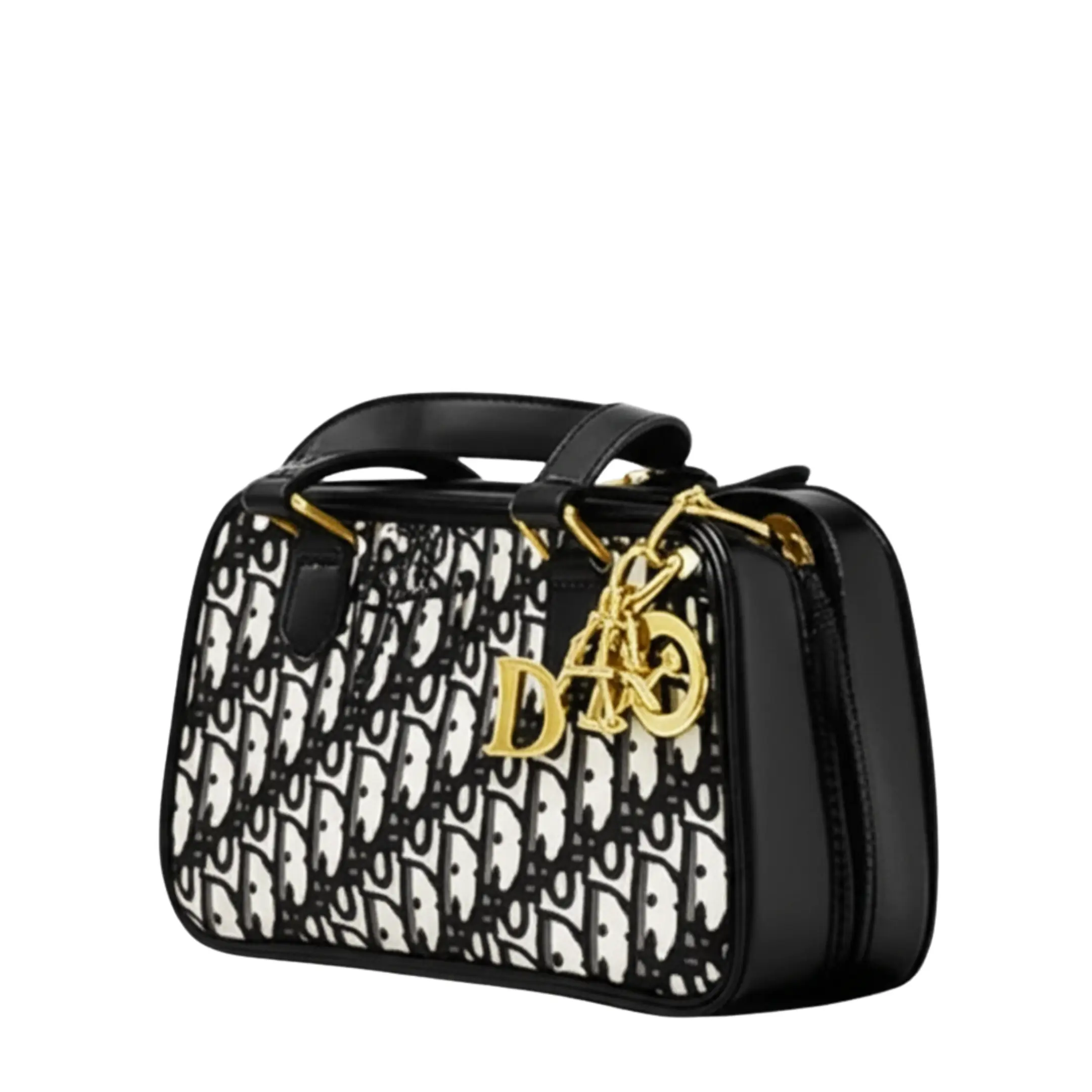 Make a chic statement with this structured top-handle bag, inspired by a timeless luxury design. It features a striking black and white Oblique-style pattern across the body, contrasted with smooth black trim, a sturdy top handle, and sides. The bag is adorned with elegant gold-tone hardware, including a dangling “D” charm and other complementary details, adding a touch of glamour. With its compact yet organized interior and secure zipper closure, this bag is perfect for carrying your essentials with sophisticated style for any special occasion or a stylish day out.