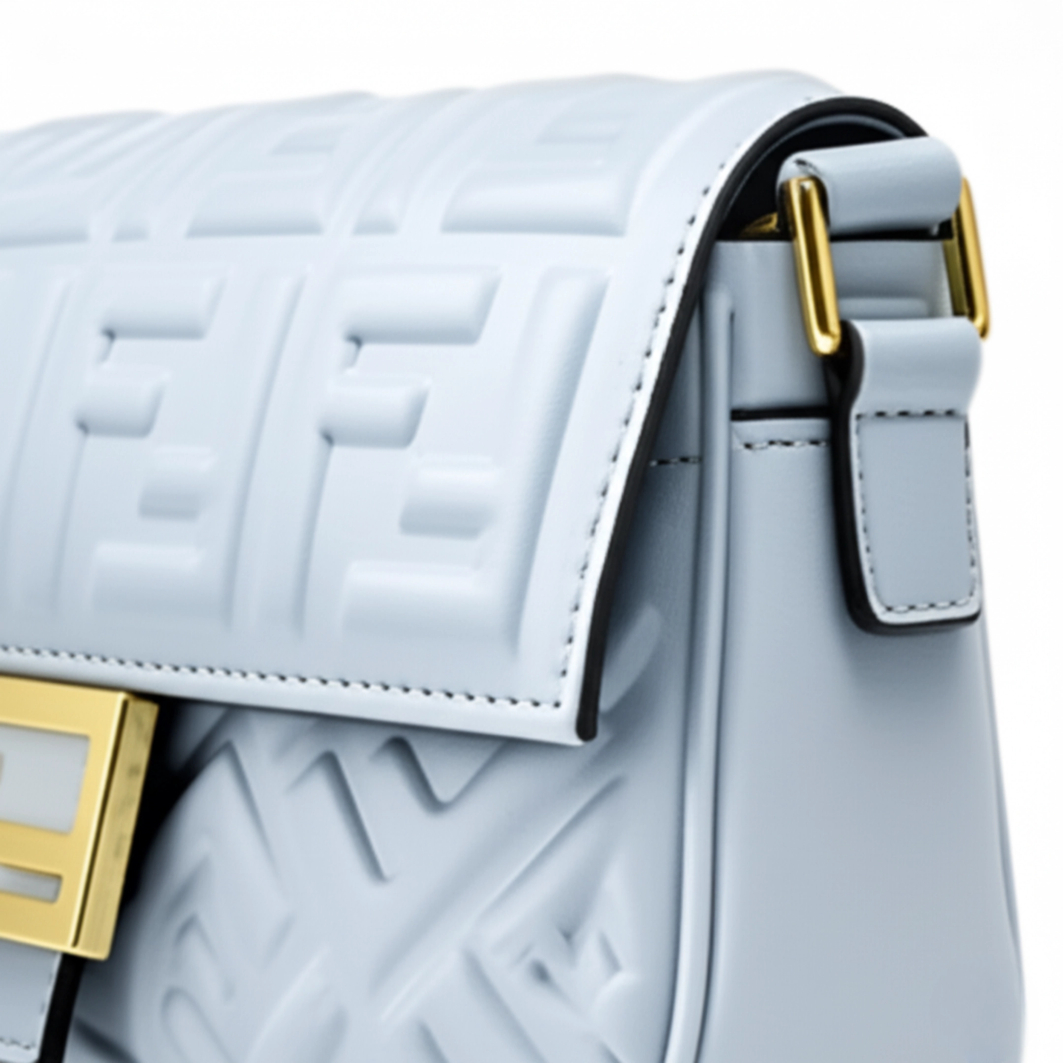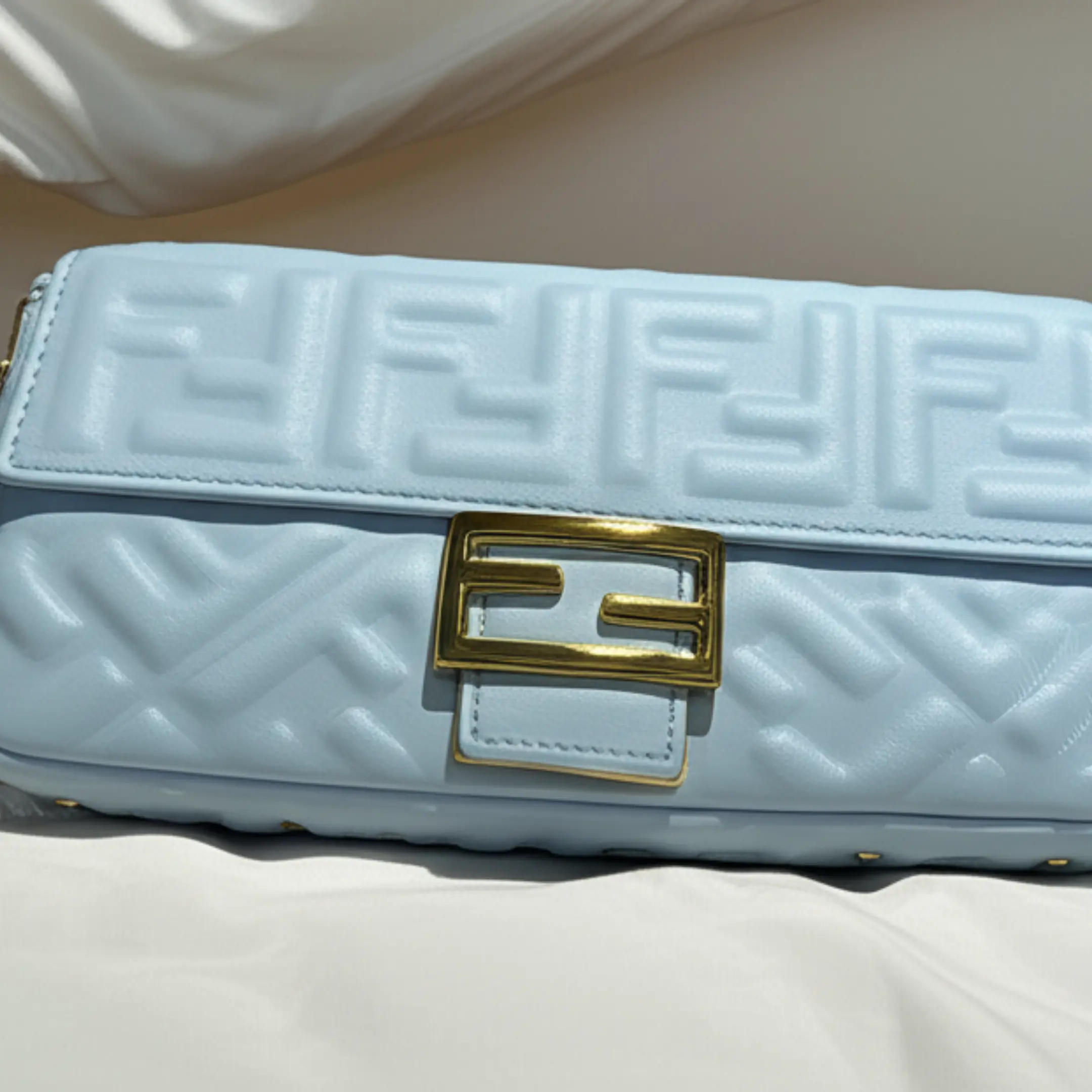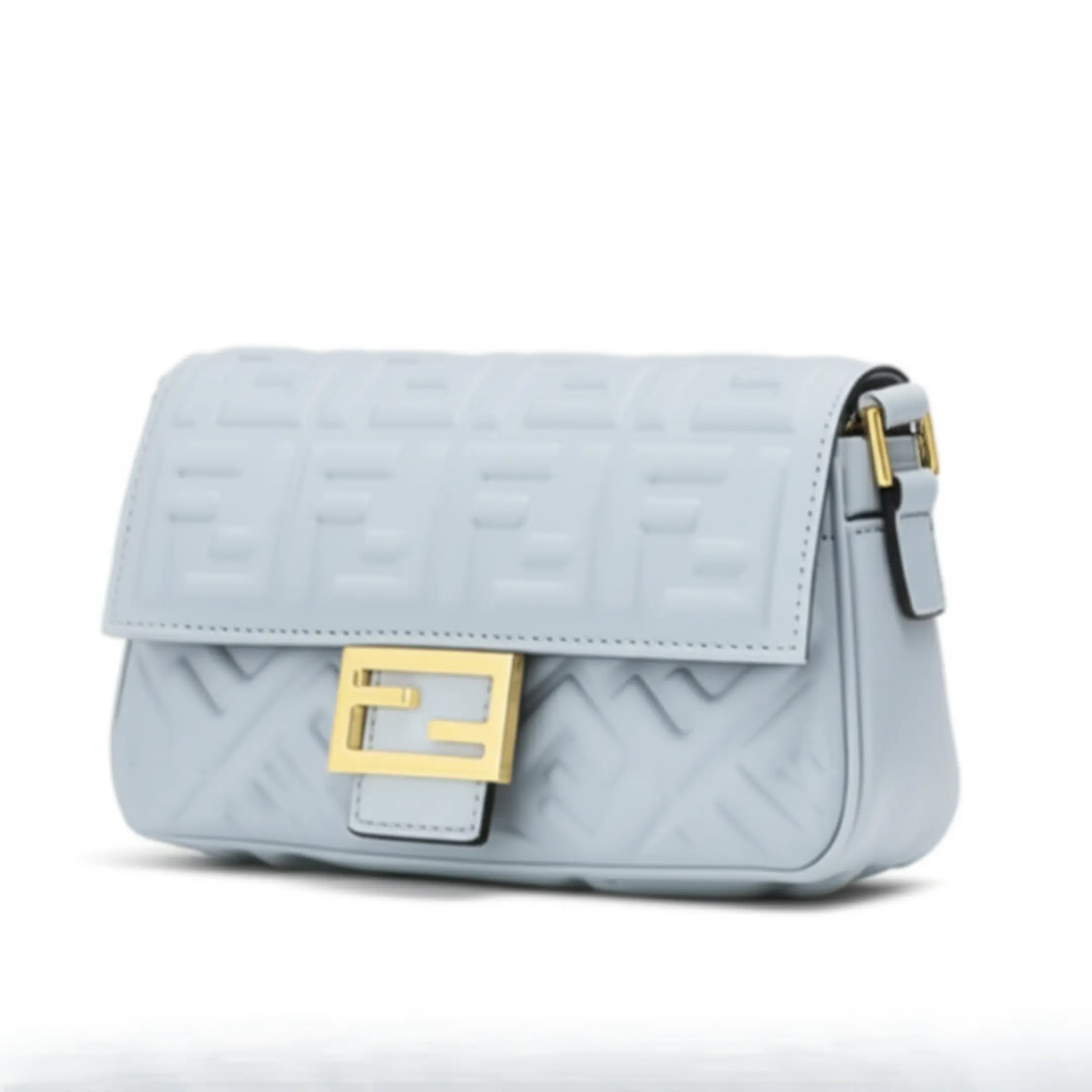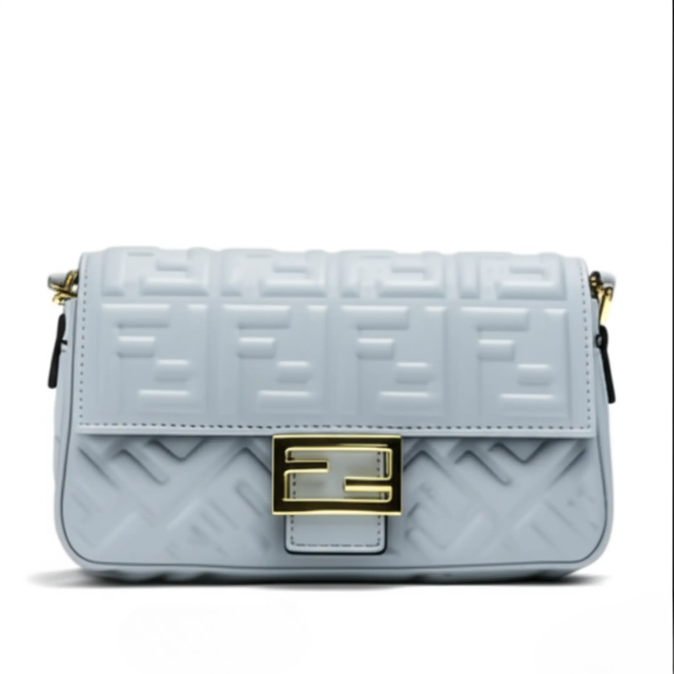 This trendy baguette-style bag captures the essence of luxury with its embossed “F” logo pattern and classic rectangular shape. Crafted in a beautiful light blue faux leather, the bag is both stylish and soft to the touch. It is finished with an iconic gold-tone “FF” clasp on the front flap, which secures your belongings with a chic flourish. The compact size is perfect for carrying your phone, wallet, and other small essentials, making it an ideal choice for a night out or a casual day trip.