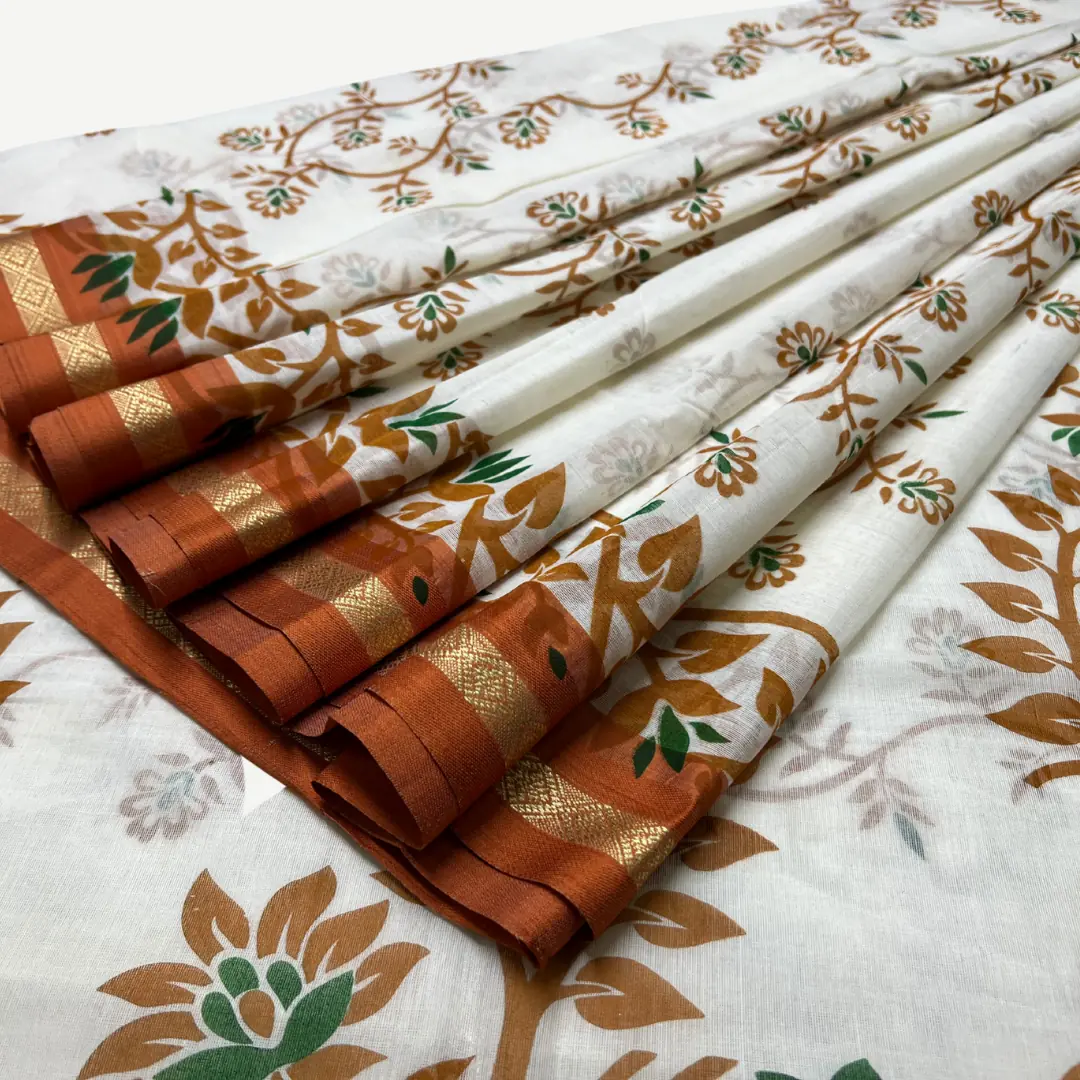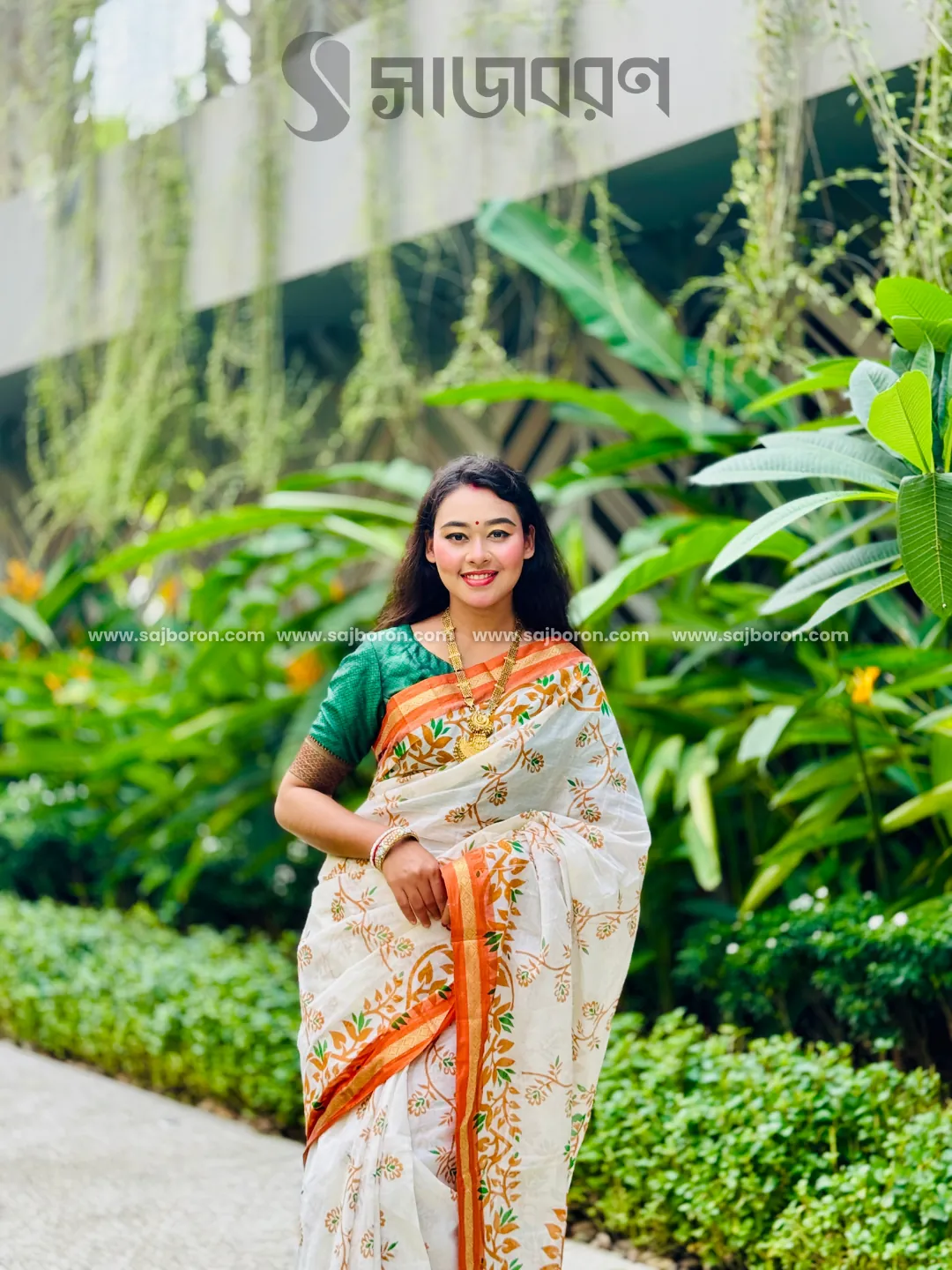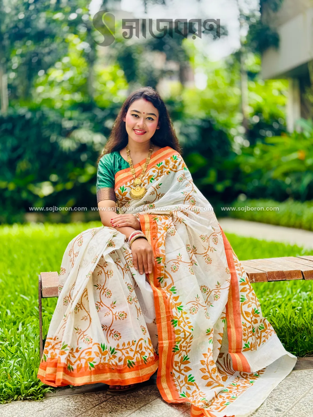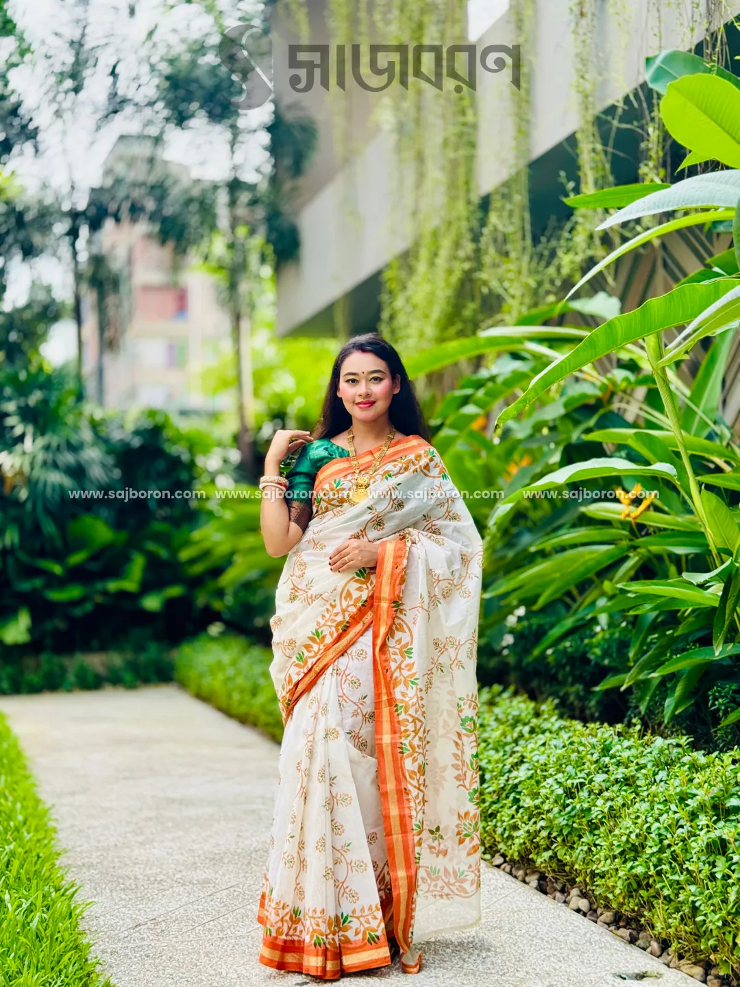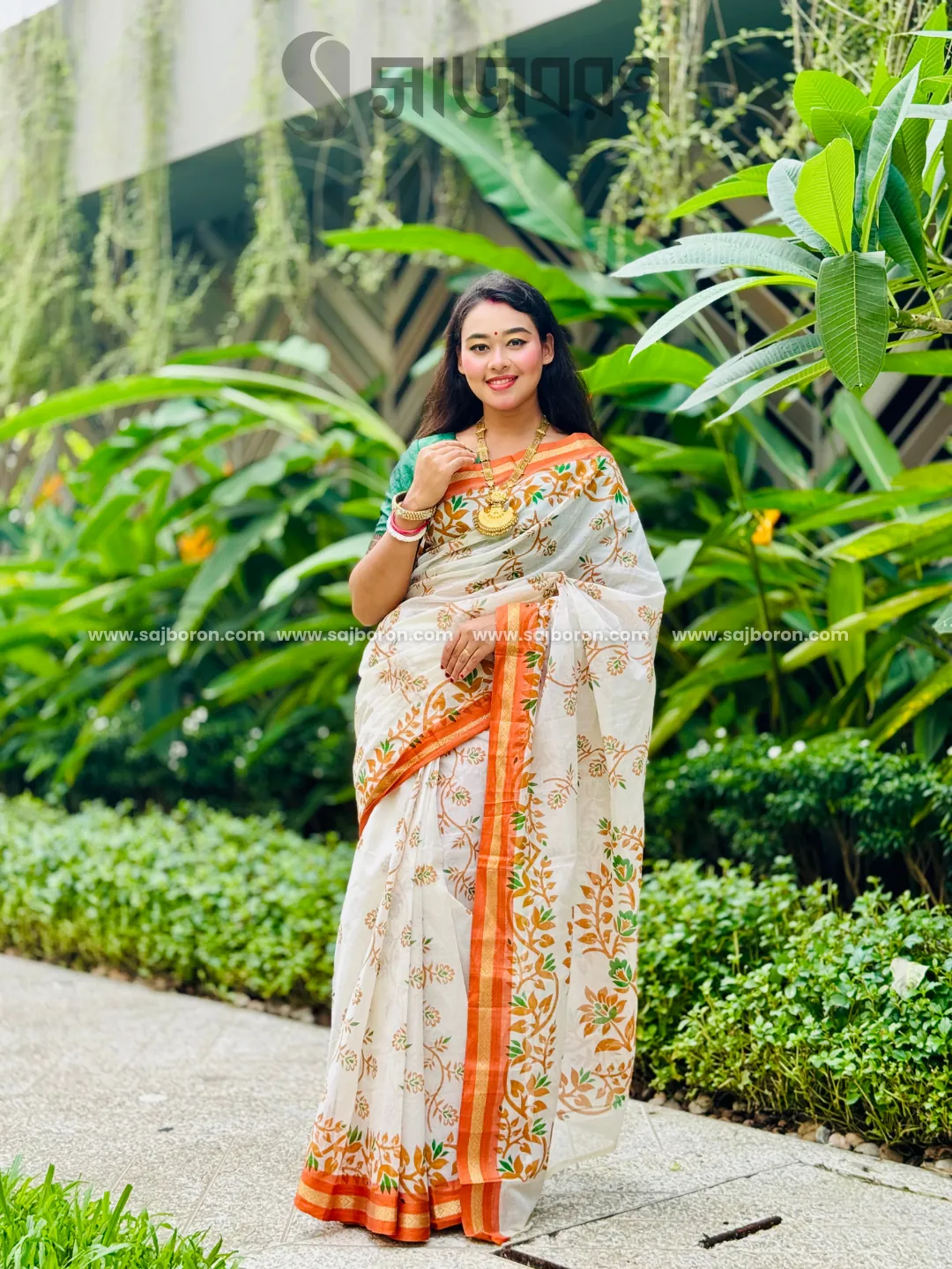 ঐতিহ্যবাহী হাতে বোনা সুতির তাঁতের শাড়ি। স্নিগ্ধ সাদা জমিনে ব্লক প্রিন্টের সুন্দর নকশা এবং আকর্ষণীয় টেরাকোটা ও সোনালী জরি পাড়। শাড়িটি খুবই হালকা ও আরামদায়ক, যা রোজকার ব্যবহার বা যেকোনো উৎসবের জন্য মানানসই।
