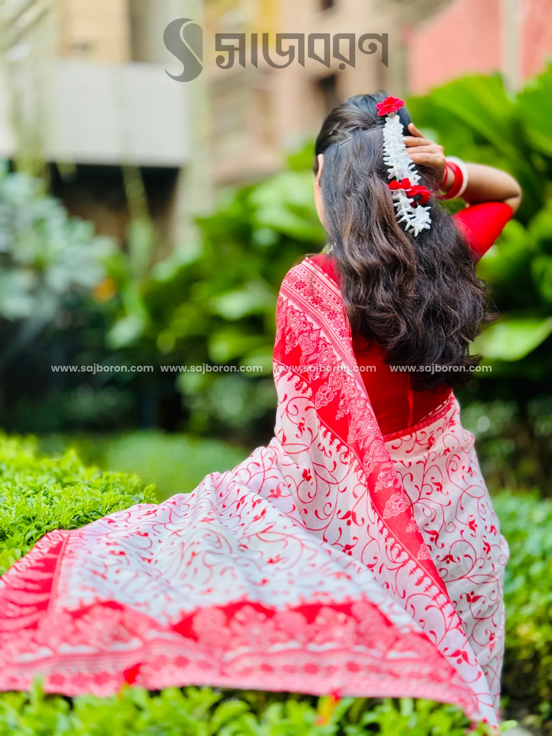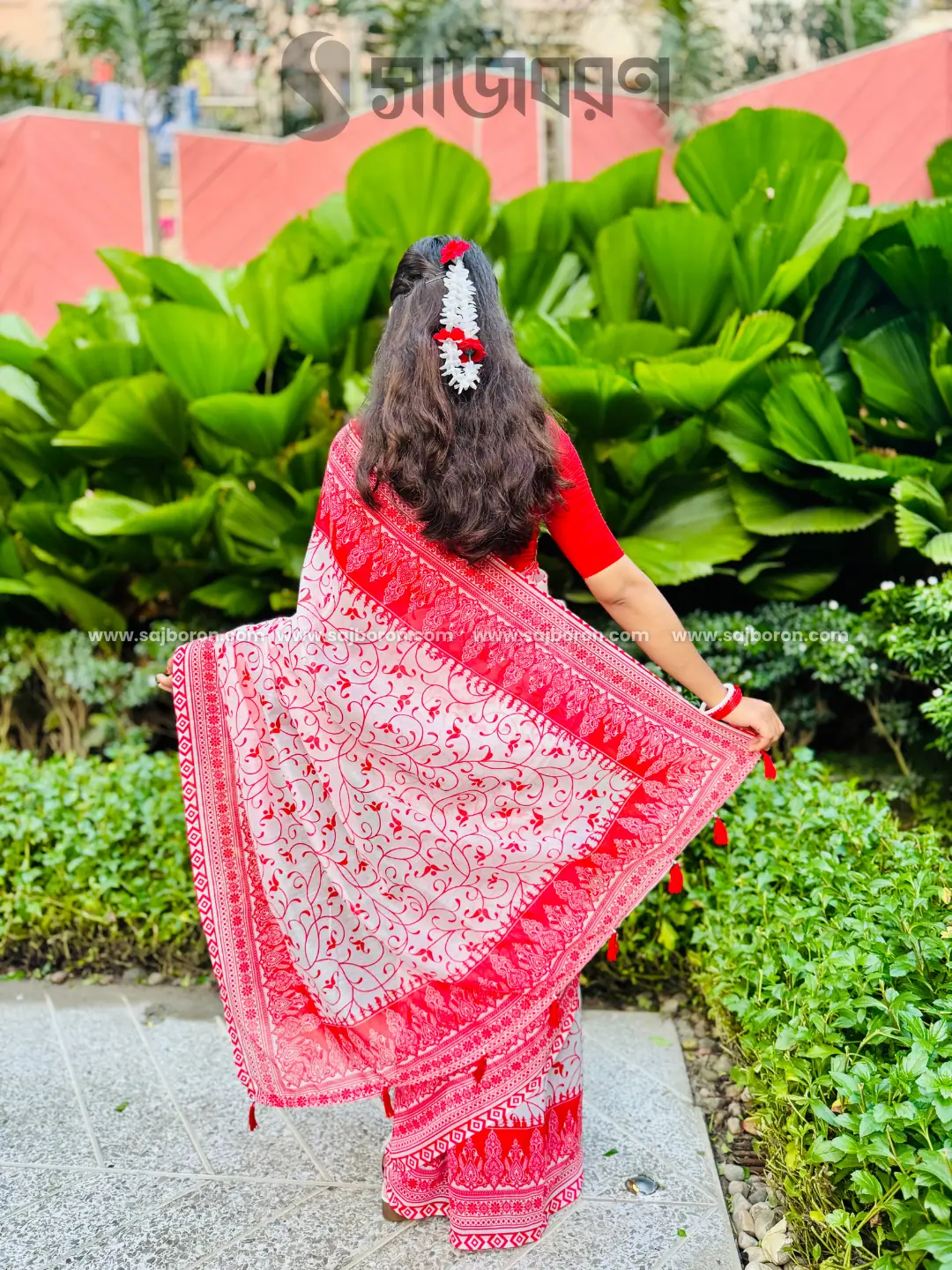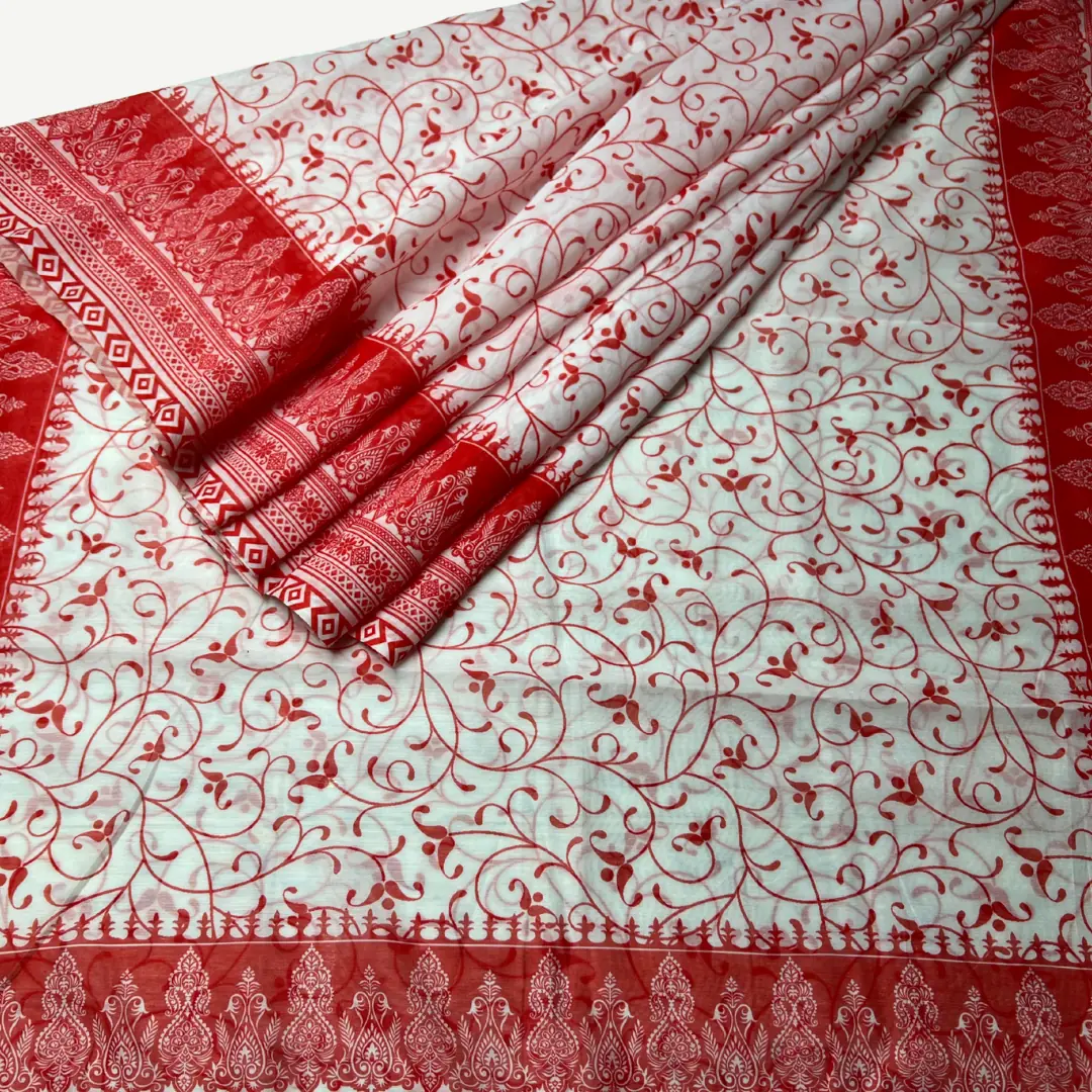 ডিজাইনে আছে জমকালো ফ্লোরাল ও ক্লাসিক প্রিন্ট, পাড়ে ও আঁচলে টকটকে লালের আকর্ষণীয় কারুকাজ।