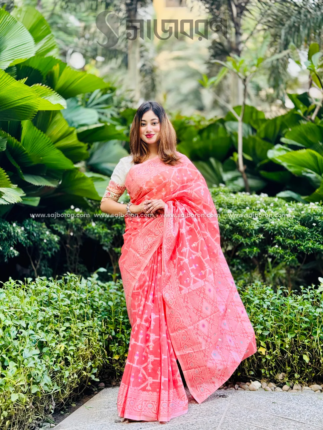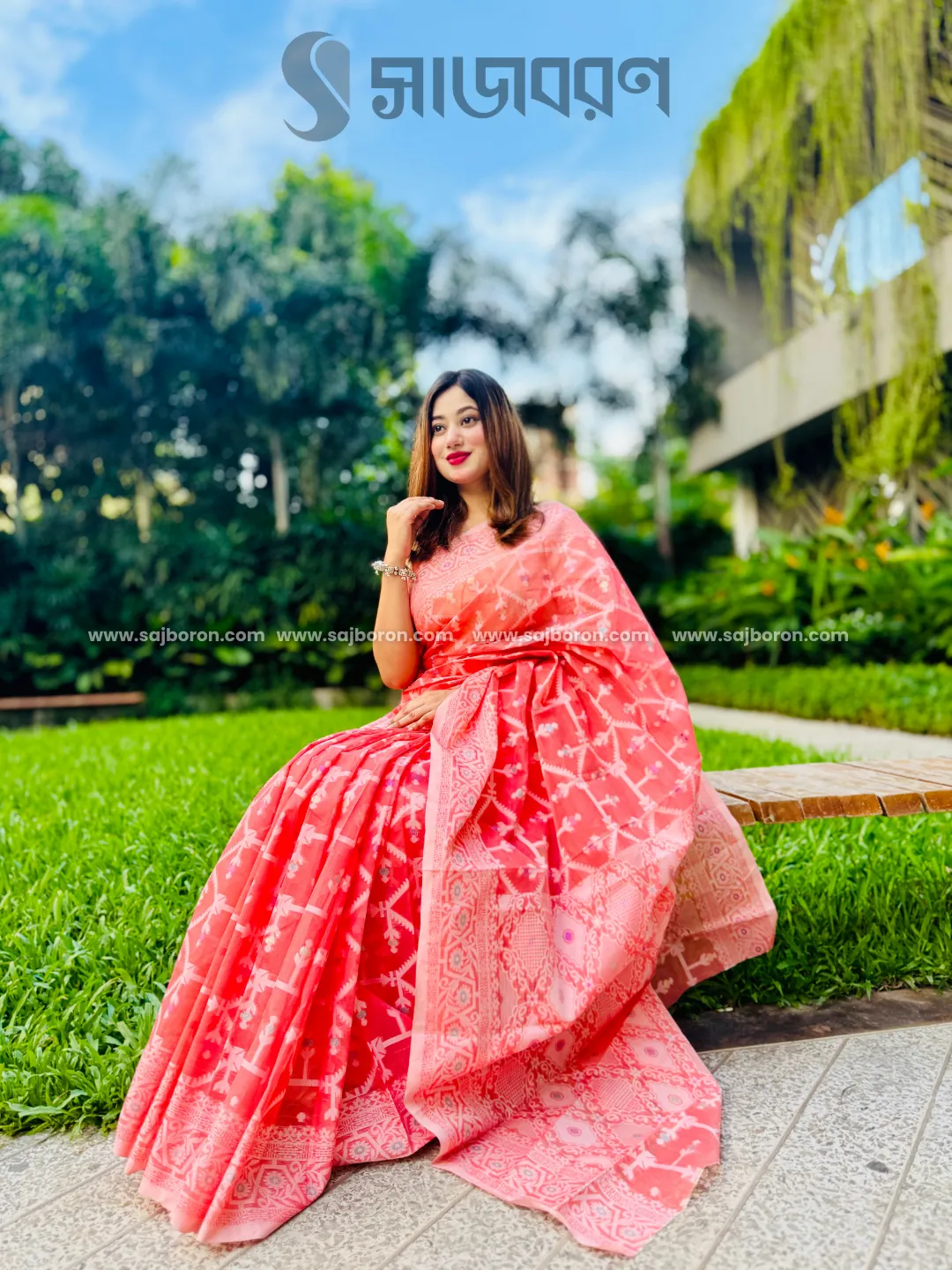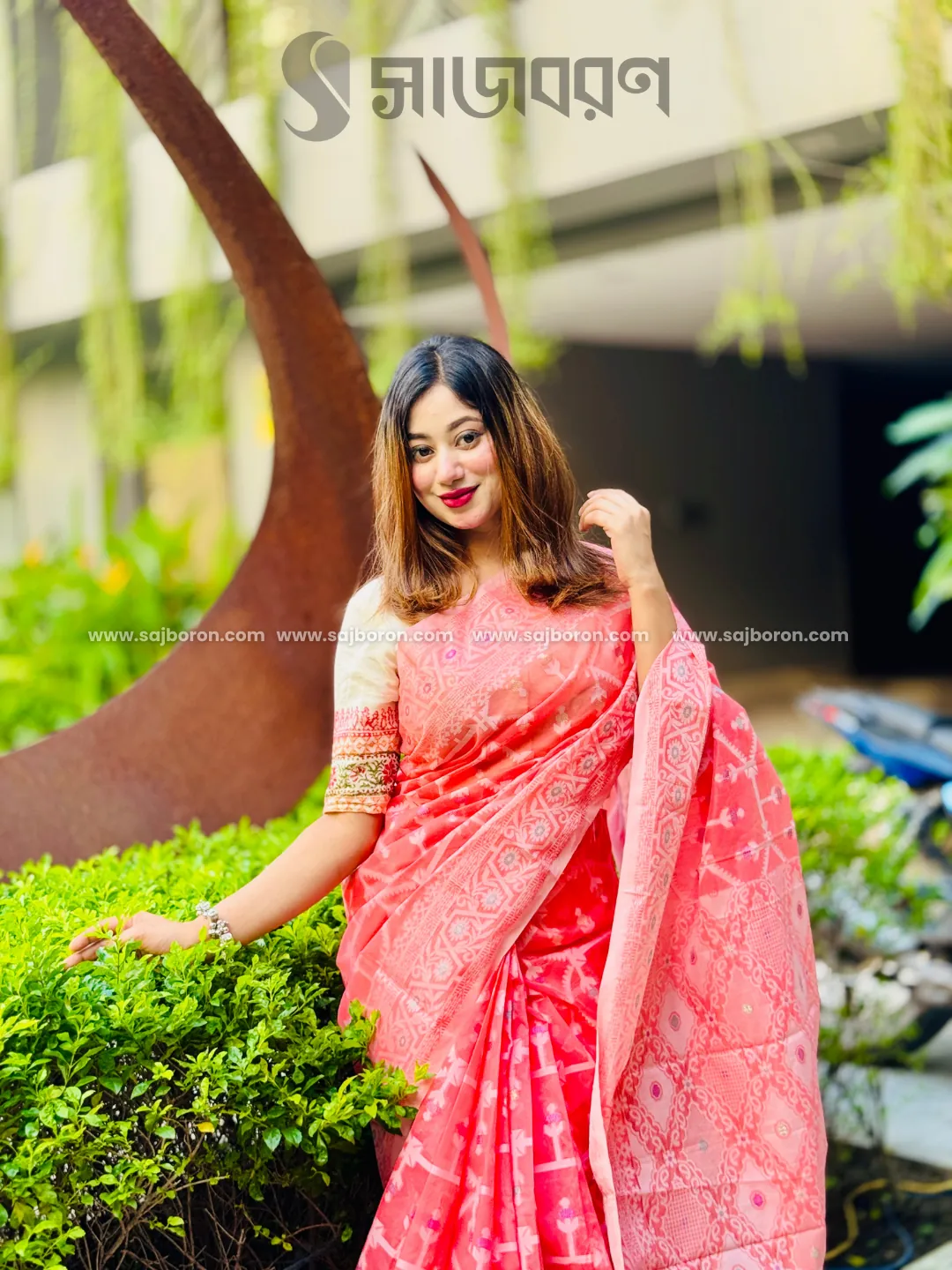 ডিজাইন: সারা শাড়িজুড়ে জটিল ও সূক্ষ্ম নকশার কাজ রয়েছে। এর পাড় এবং আঁচলের ডিজাইন শাড়িটিকে আরও অনন্য করে তুলেছে।