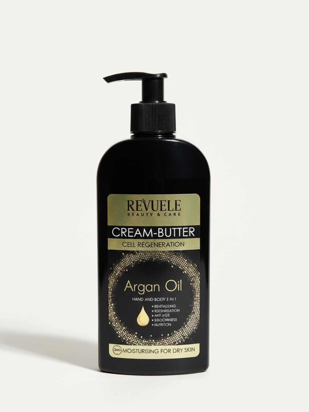 A hand and body 3in1 cream-butter containing Argan Oil, which offers revitalizing, regeneration, elasticity, smoothness, and nutrition. It provides 24h moisturizer for dry skin and is dispensed from a pump bottle.